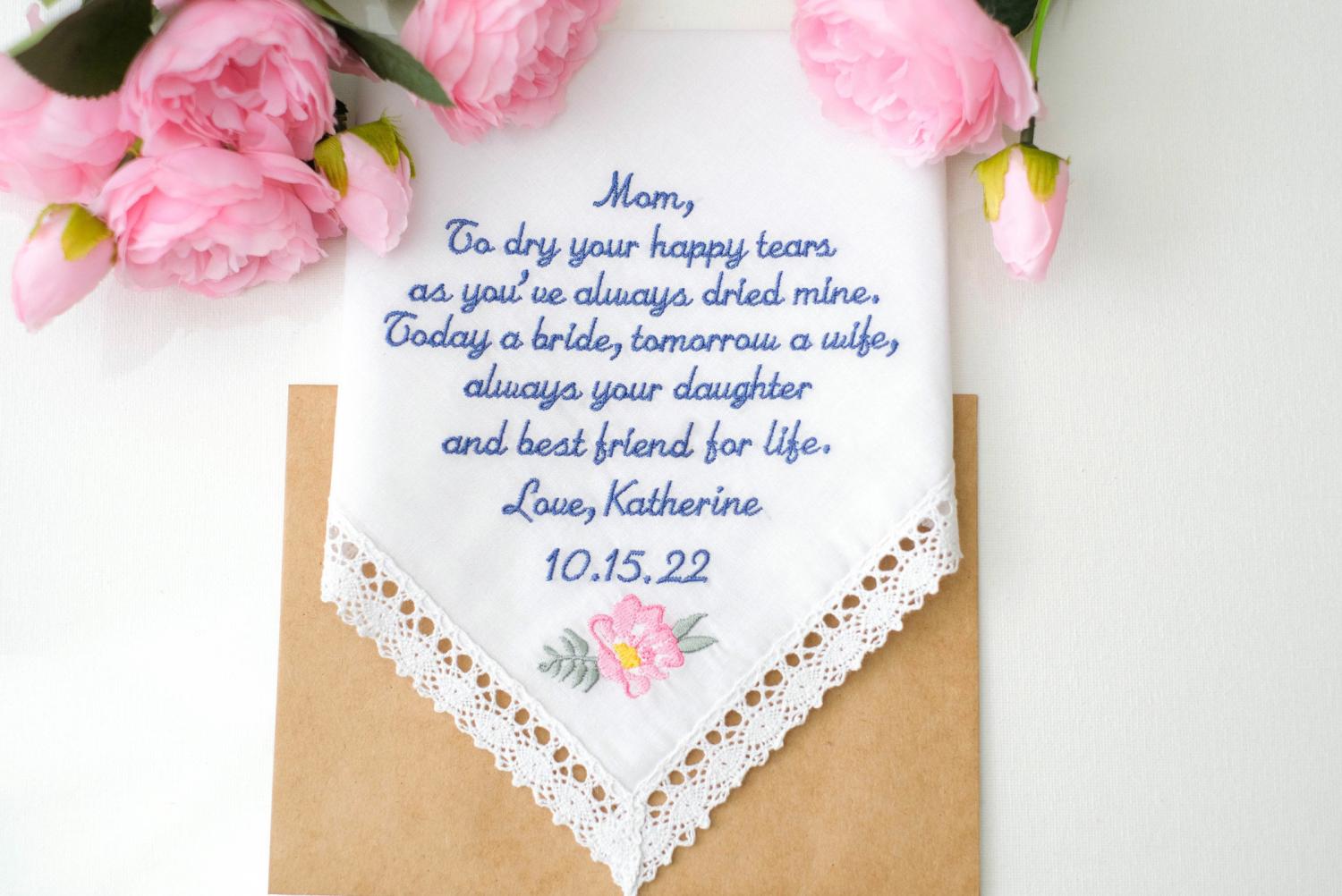 EMBROIDERED Handkerchief. Personalized Handkerchief with lace. Wedding gift for Mother of the Bride from the Bride and daughter White 100% cotton. 12'' x 12'' The text is not customizable. The same message shown in the photo will be embroidered with your name and date. Because of the embroidery process, I do not provide any proofs before production. Please make sure to ask any questions or clarifications beforehand to ensure everything meets your expectations.